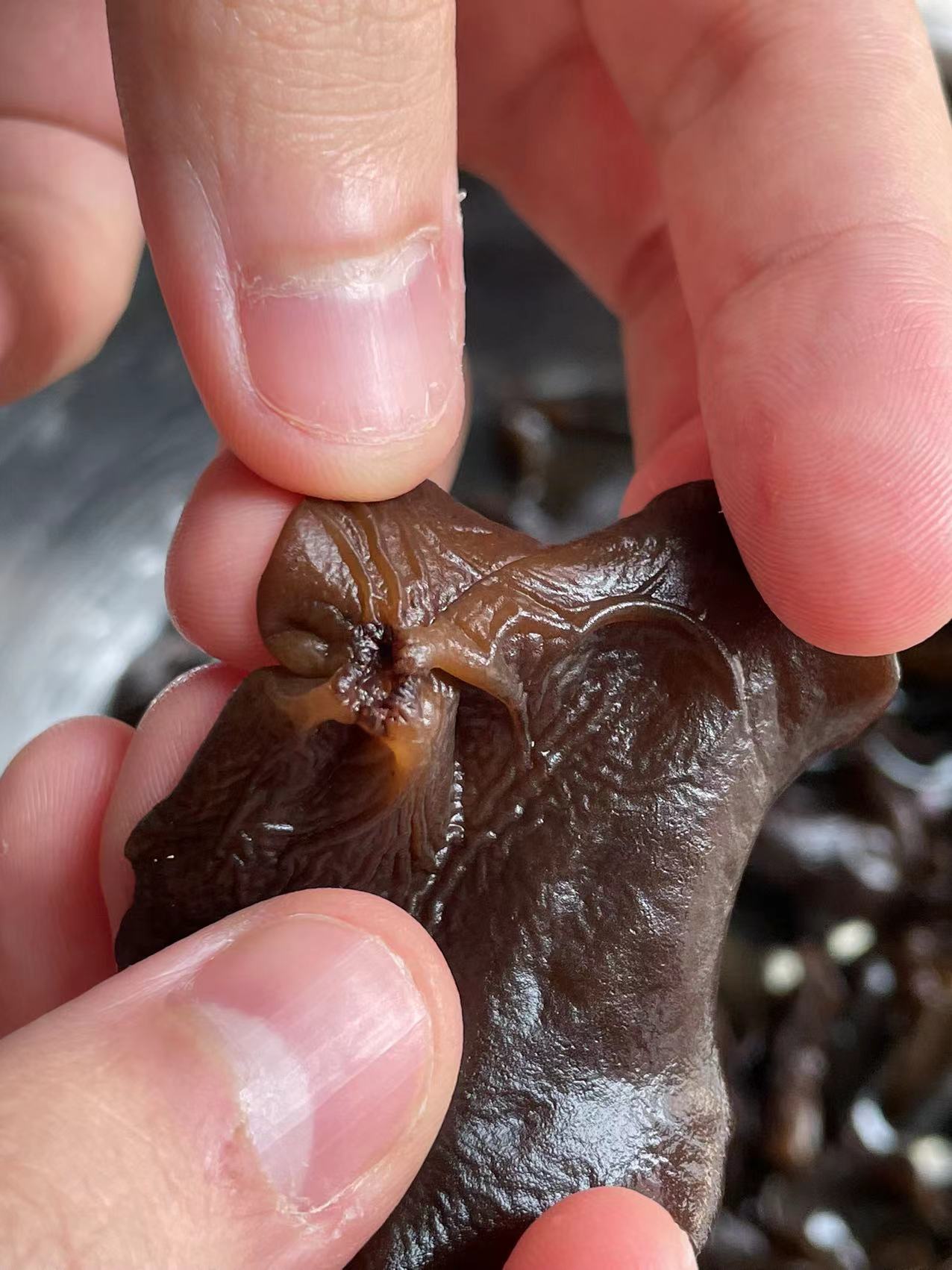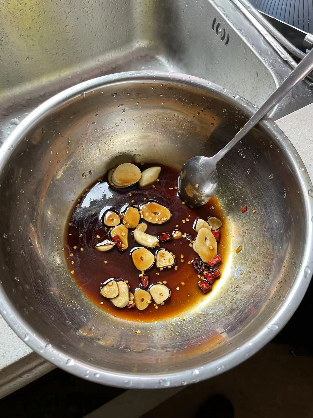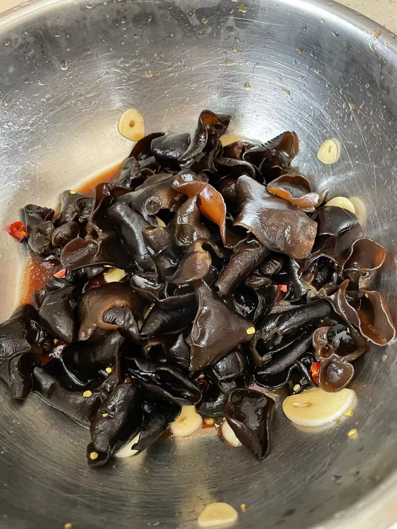 干木耳 木耳 泡发后 木耳根 木耳根 剪去部分 水煮1.5-2分钟 蒜瓣和干辣椒 调料拌匀 成品