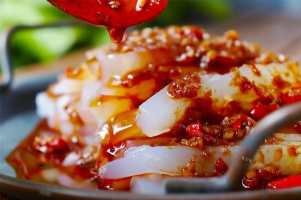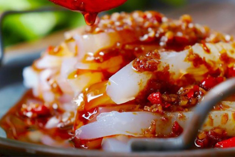 将调味料倒在凉粉上,然后撒上香菜即可。