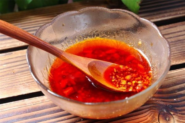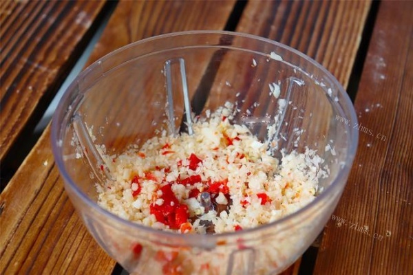 大蒜和小米辣剁成沫,放上 10g 辣椒粉,5g 花生碎,热油搅拌均匀。