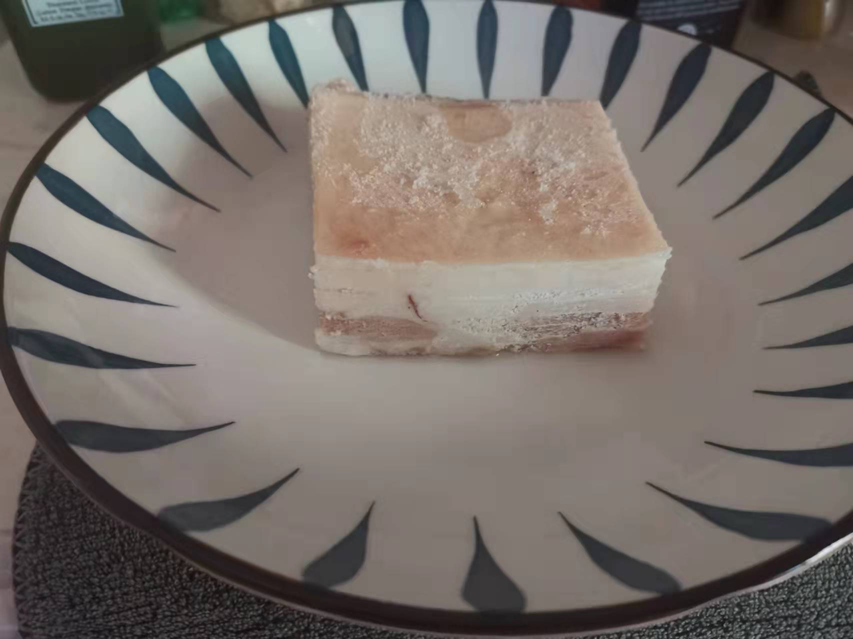 五花肉切片(后端 0.5-1 cm),放在大碗中,散上梅干菜