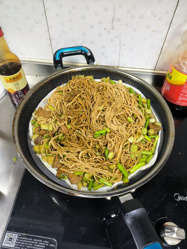 将蒸好的挂面放入,不断搅拌 3 分钟,待挂面全部均匀上色,关火