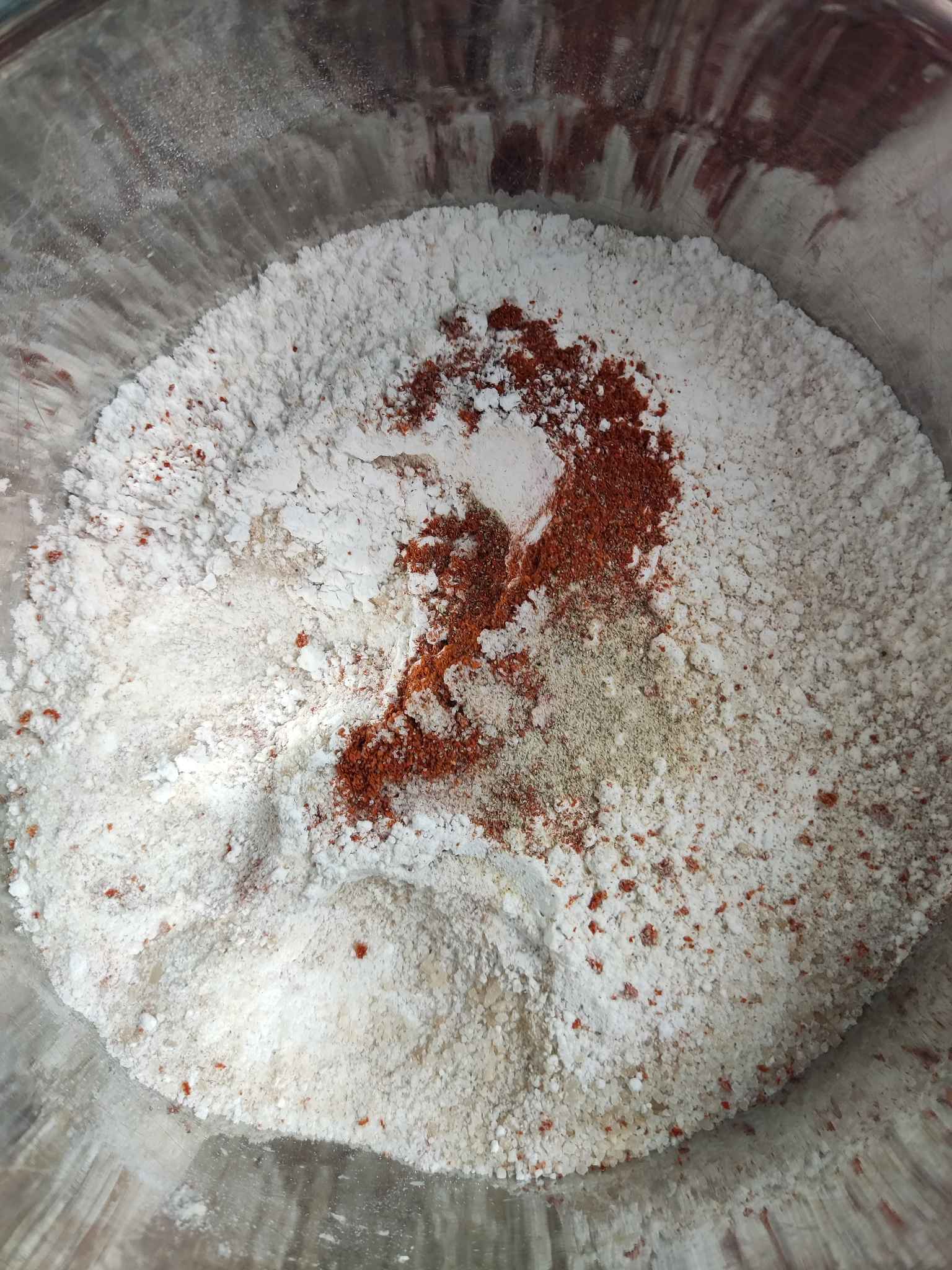 将糯米粉、粘米粉、蒸肉粉、细辣椒粉、5 克盐、白胡椒粉倒一起搅匀