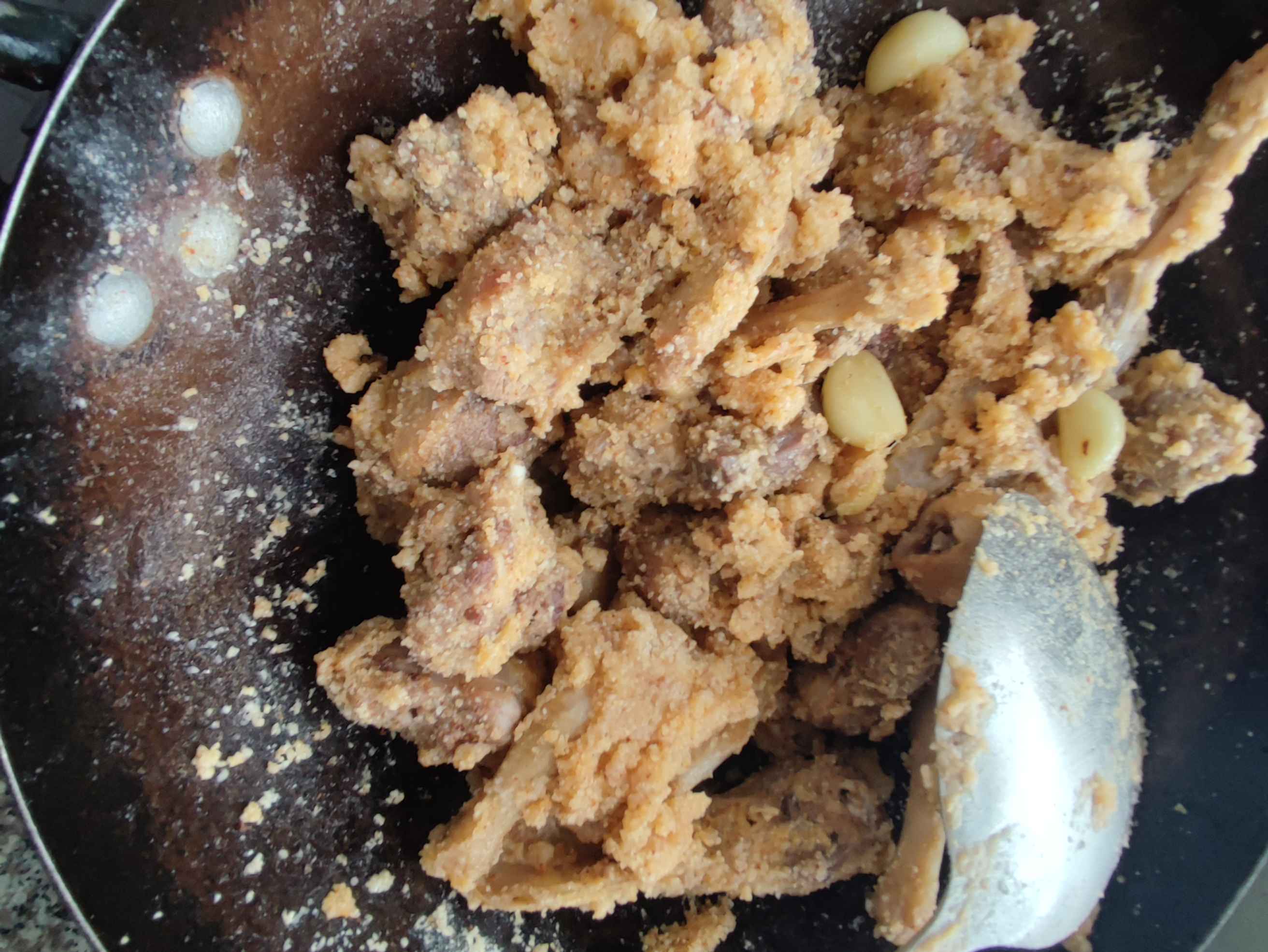 关小火倒入米粉翻炒,鸭肉均匀裹满米粉子,加入开水,少量多次的加,边加边翻炒