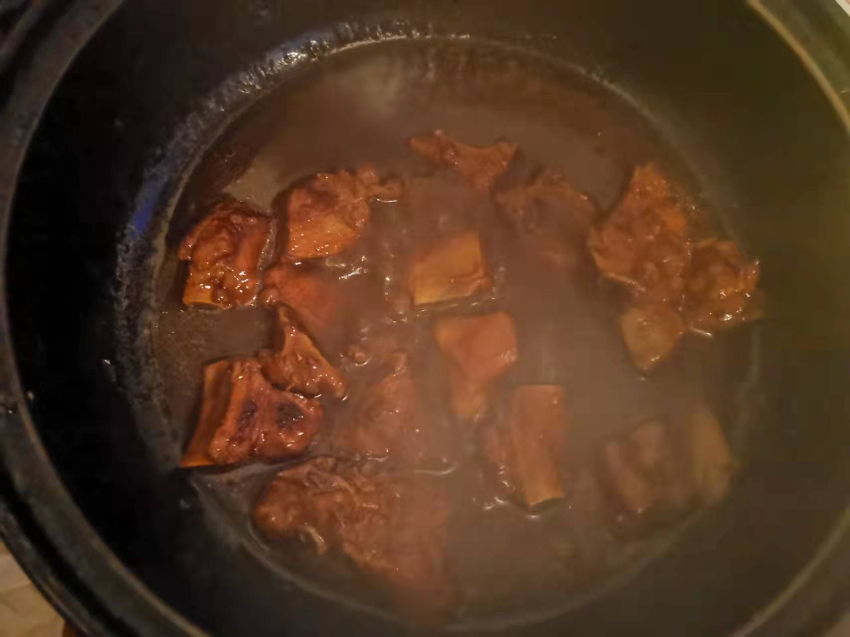 用大火将锅中液体煮沸后,加入老抽 5 ml 进行上色,并快速收汁;若排骨块较大,可转小火焖煮 5–10 分钟以便更好地入味,切勿采用中火长时间炖煮 20 分钟,以免损伤口感。
