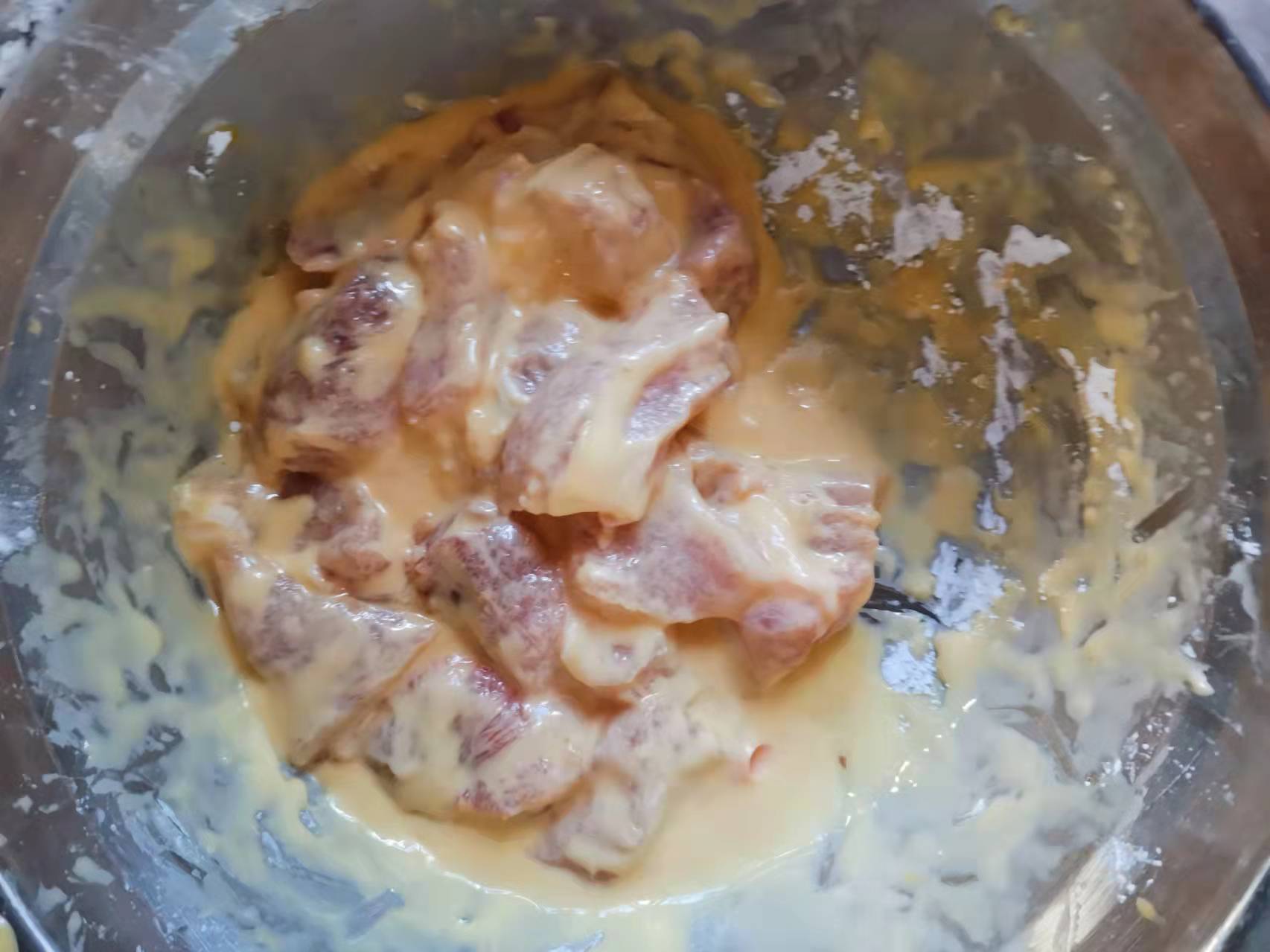 充分搅拌,直至生粉包裹住瘦肉块(太稀则继续加生粉,太干则加水),然后加入 5 ml 油,在充分搅拌后备用