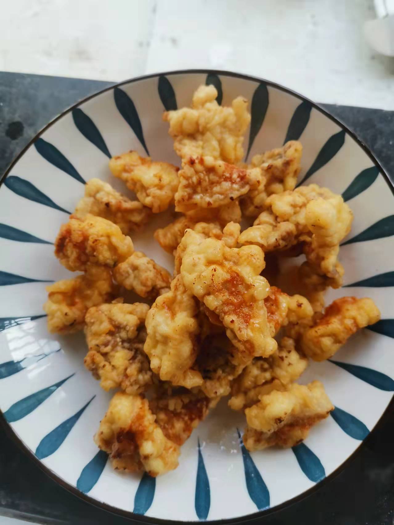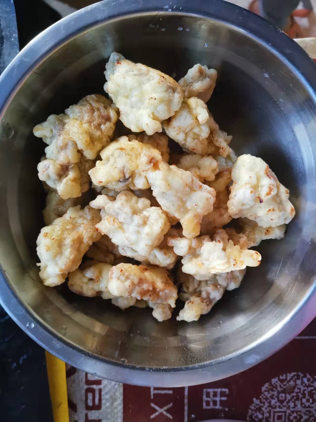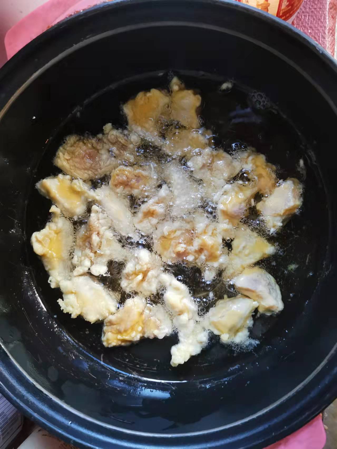 取出瘦肉,一分钟后倒入油锅中继续炸,直至瘦肉块表面出现焦黄后,取出放入大碗备用