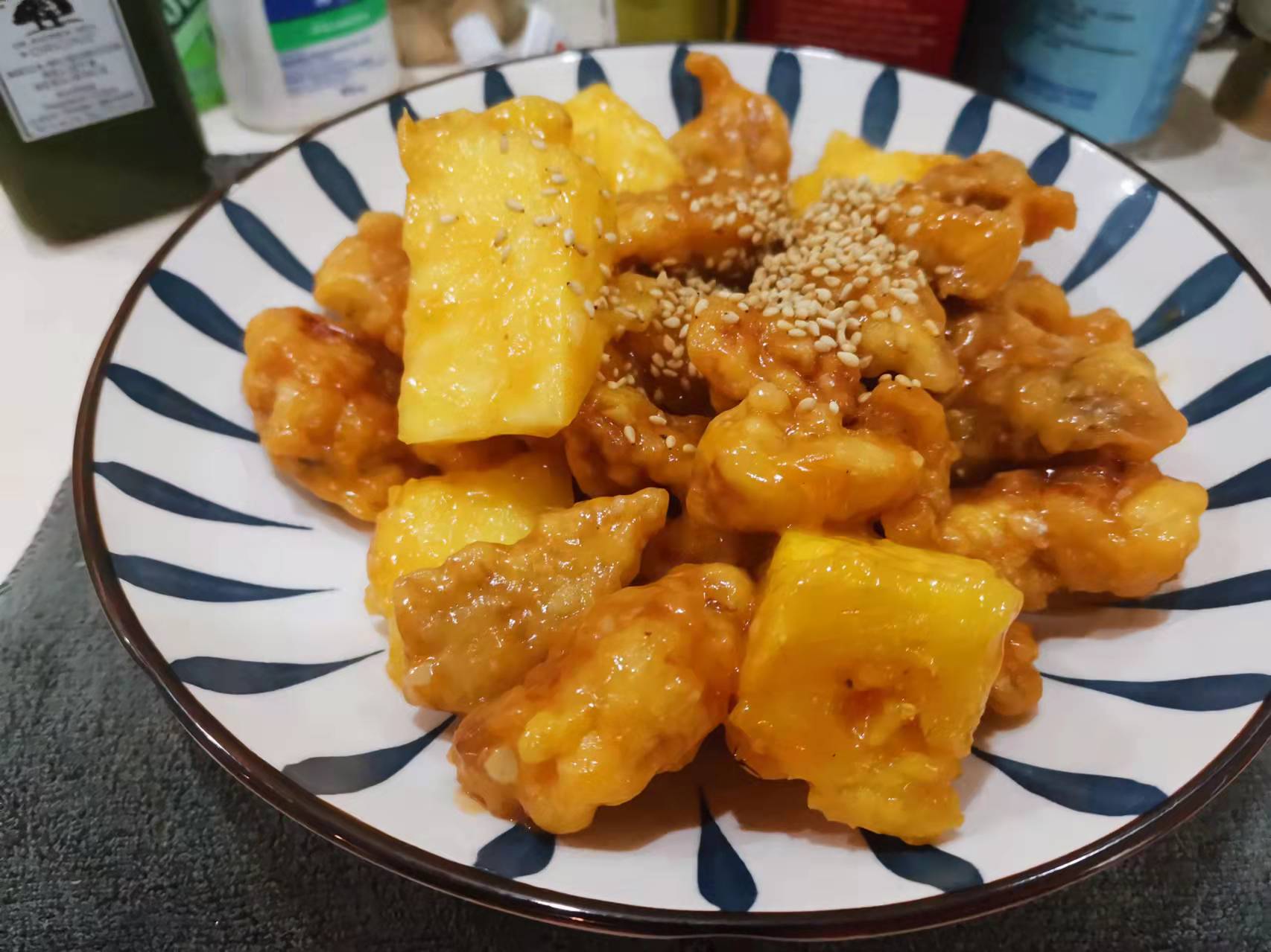 起锅,倒入汤汁,30 S 后倒入瘦肉块、凤梨块,充分翻炒后 出锅
